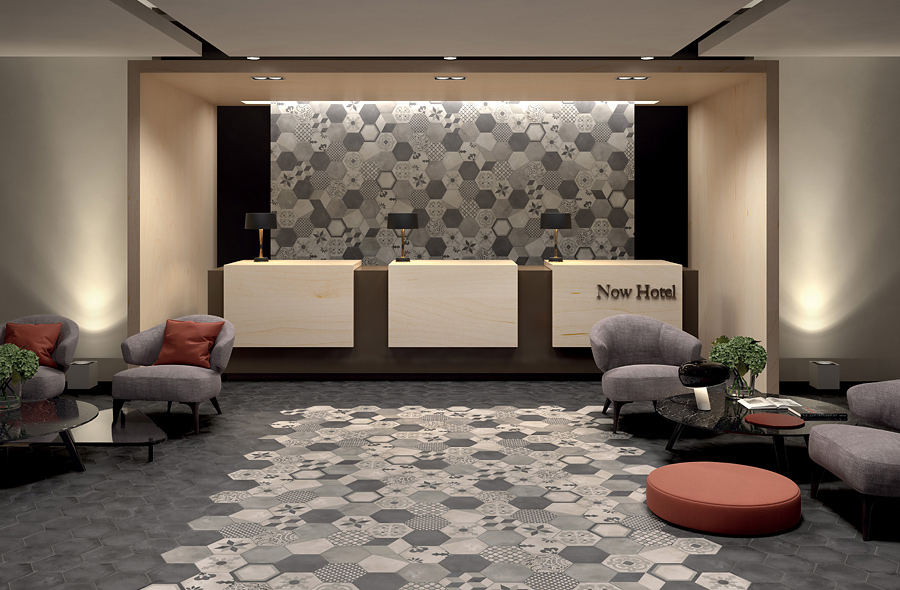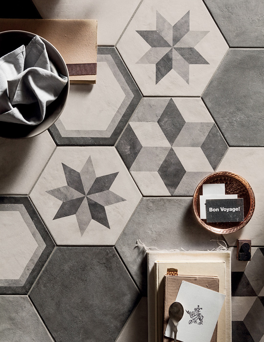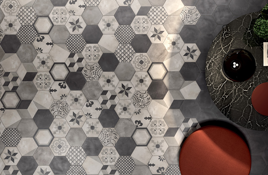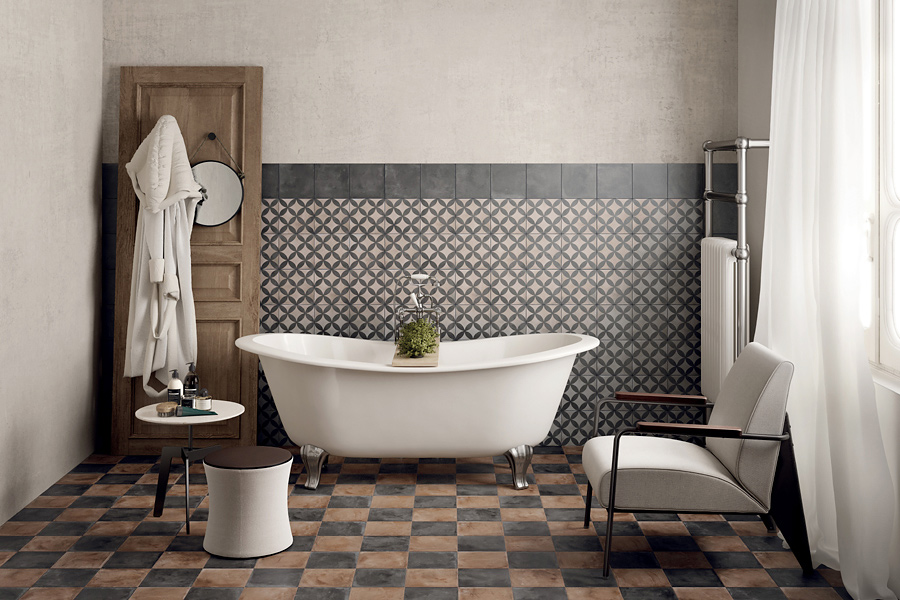 Diese Bodenbeläge und Wandverkleidungen aus durchgefärbtem Feinsteinzeug ahmen die Cotto-Zement-Optik tatsächlich perfekt
